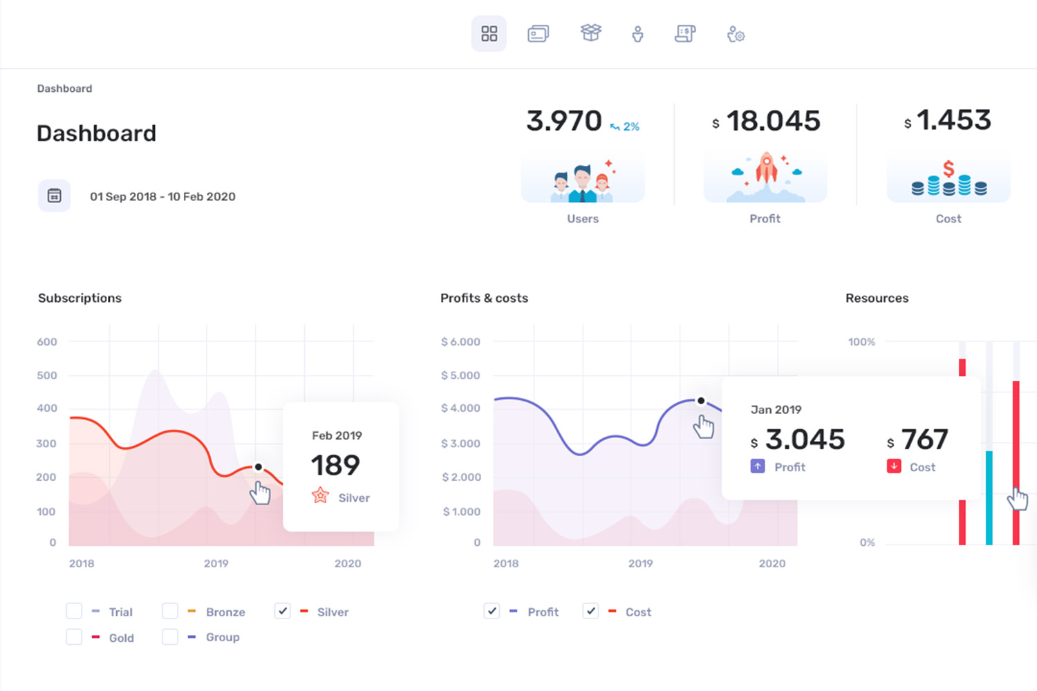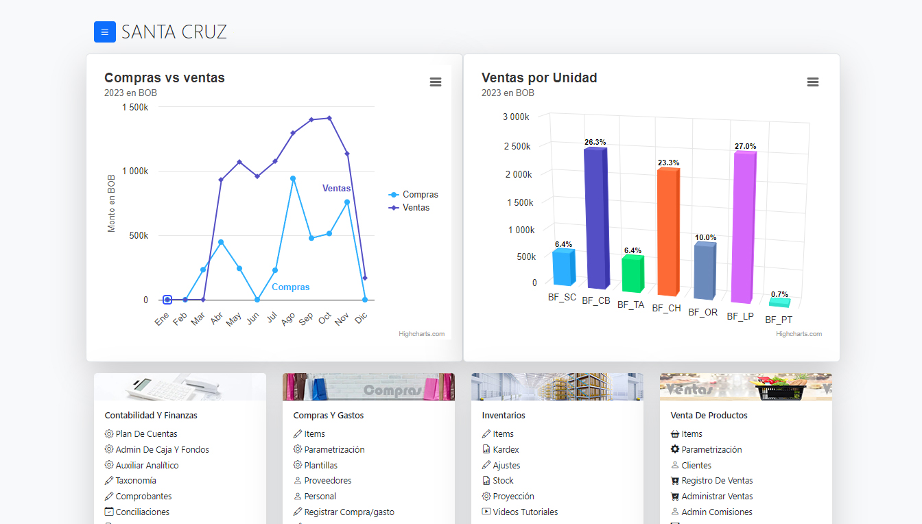 Contiene varios reportes de ventas, ingresos, gerenciales, etc. tanto como tablas exportables a MS Excel o reportes gráficos exportables a imágenes.